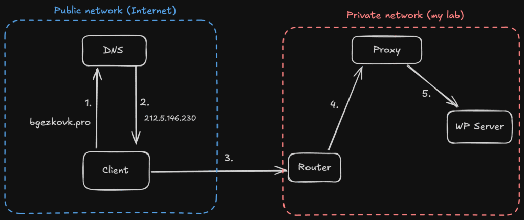Step 1 and 2 are generally not handled by us, we only need to concern our selfs with steps 3 to 5. On the router all we need to do is to open port 443 (default port for https traffic) and point it towards our proxy. On the proxy we need to configure the passthrough, meaning that when the proxy receives traffic that is destined for bgezkovk.pro it will forward it to the ip of the host machine running my wordpress instance.